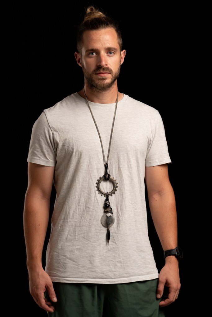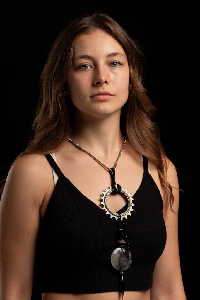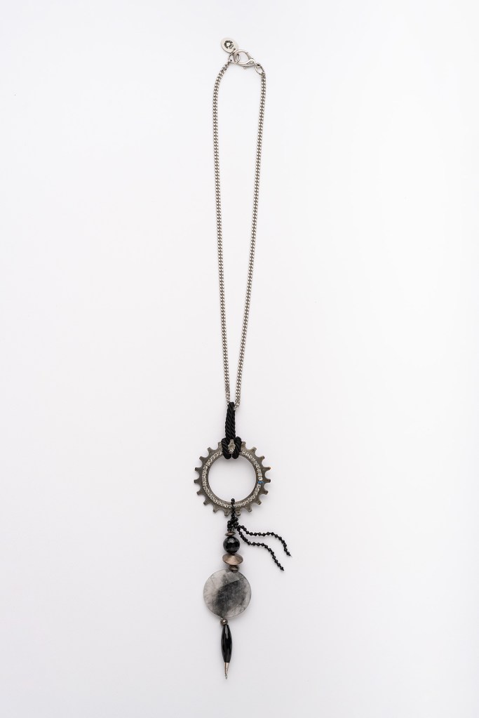 Catena con ciondolo. Sono uniti fra loro da un cordone attorcigliato di velluto nero. Il ciondolo è un pezzo industriale decorato con cristalli color diamante. Inoltre vi sono una sessantina di minute ingranate; argenti indiani, una granata sferica sfaccettata, un disco bombato di quarzo grigio e un’onice nera oblunga.