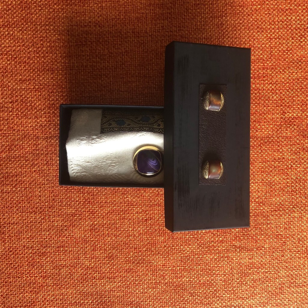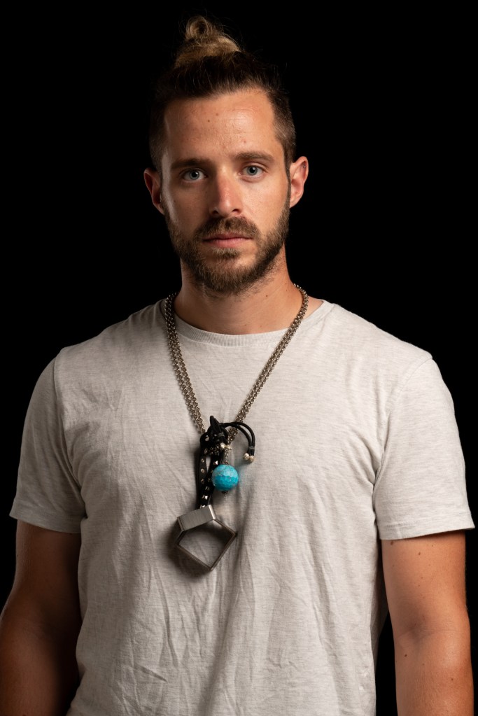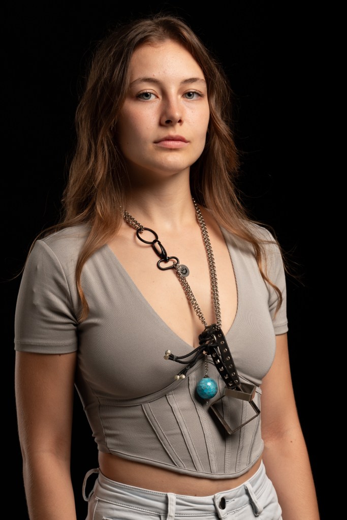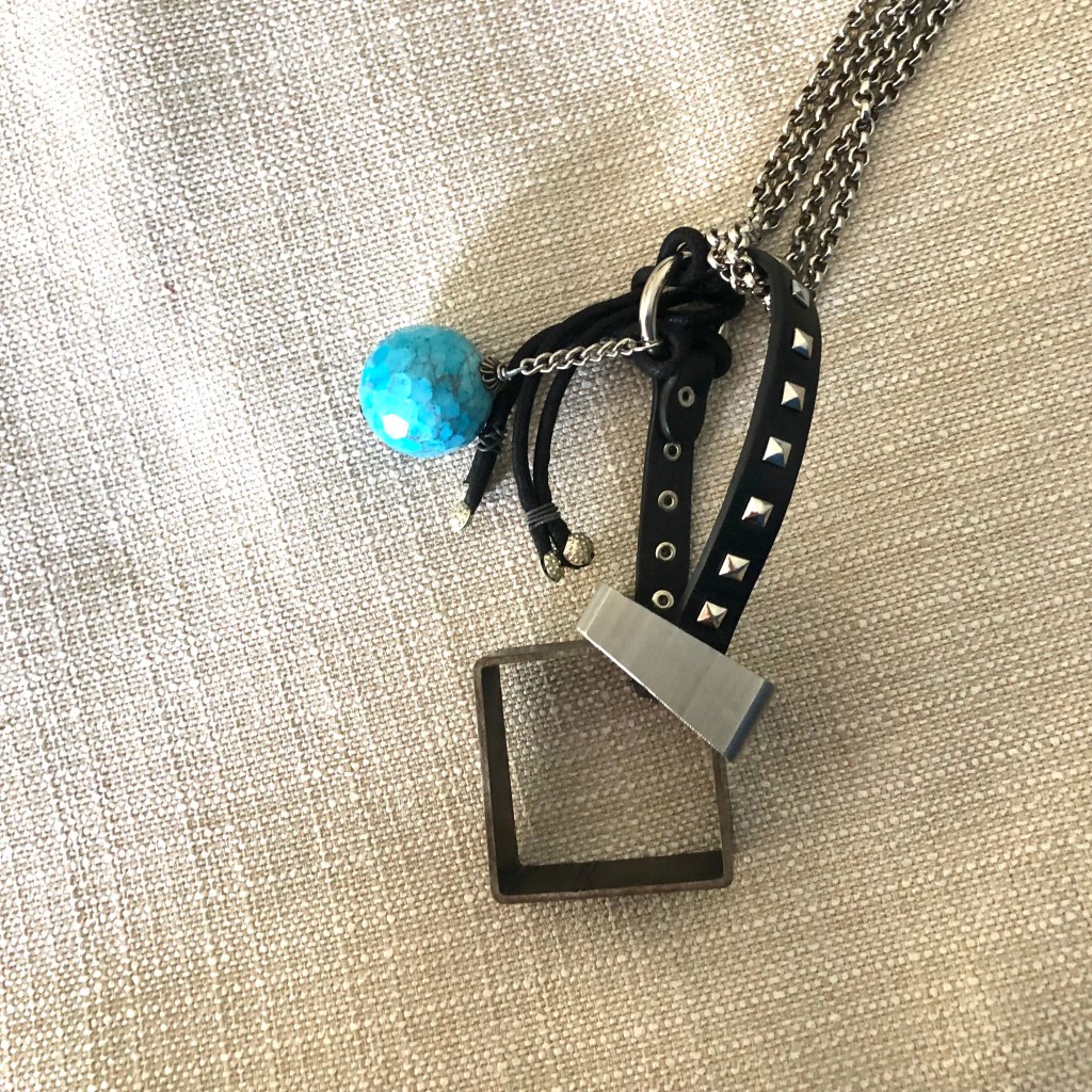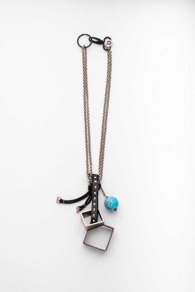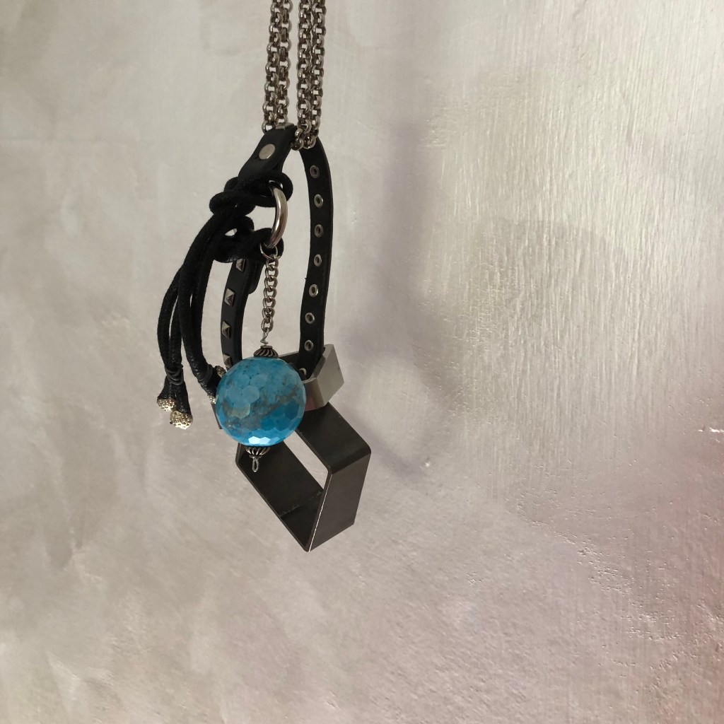 Catena color argento con ciondolo. Il ciondolo è un incastro, non risolutivo, di due pezzi industriali, un’azzurrina di forma sferica e anche poliedrica con circa un centinaio di facce, un pezzo di pelle con puntature piramidali di acciaio che un tempo faceva parte di un bracciale in stile sadomaso.