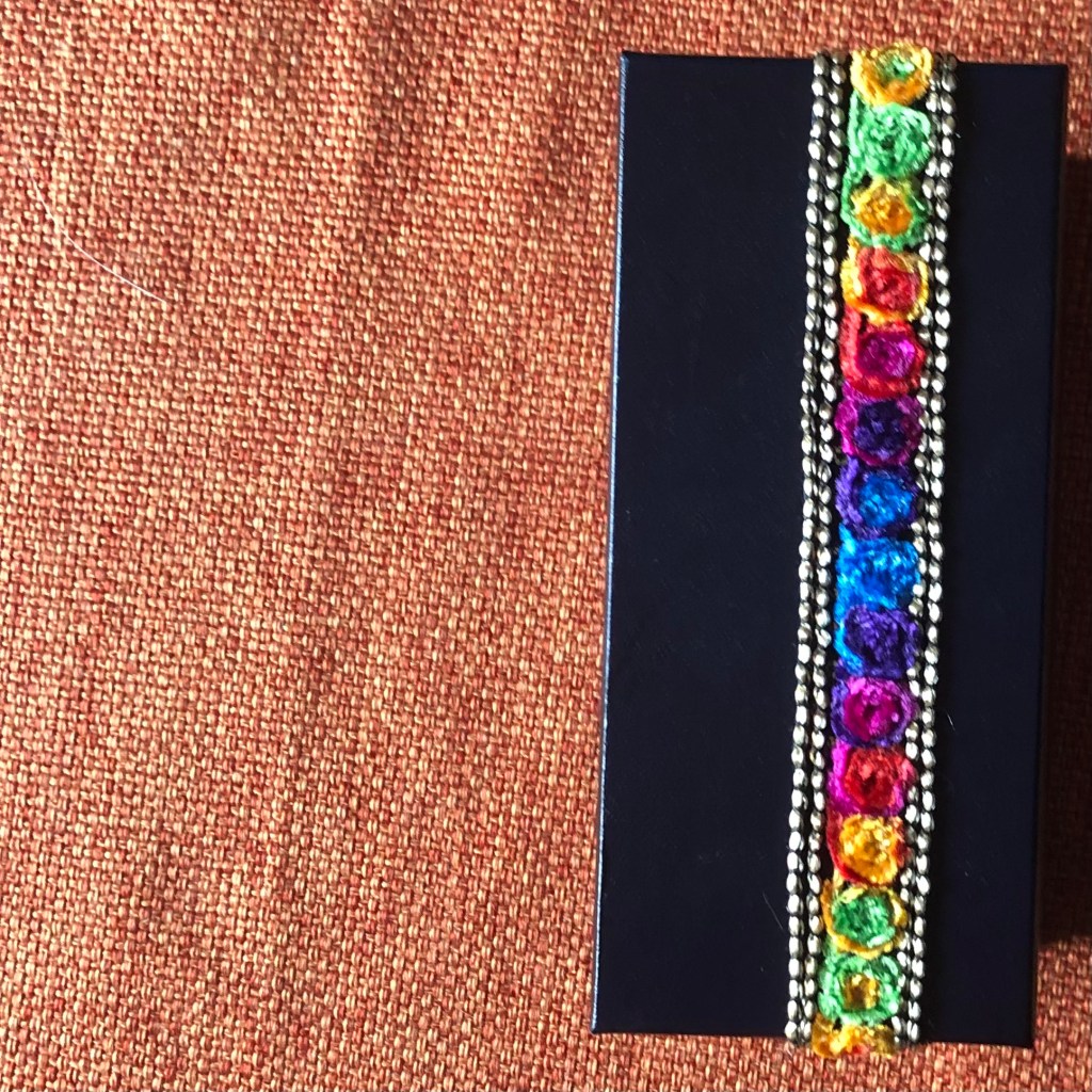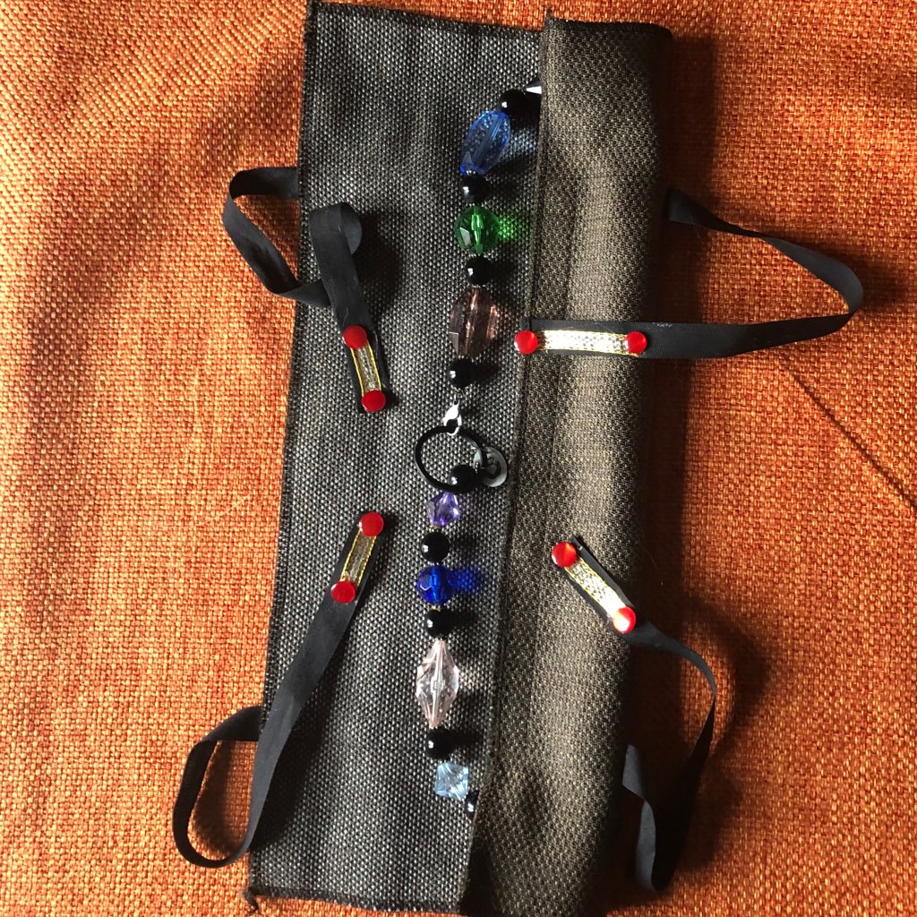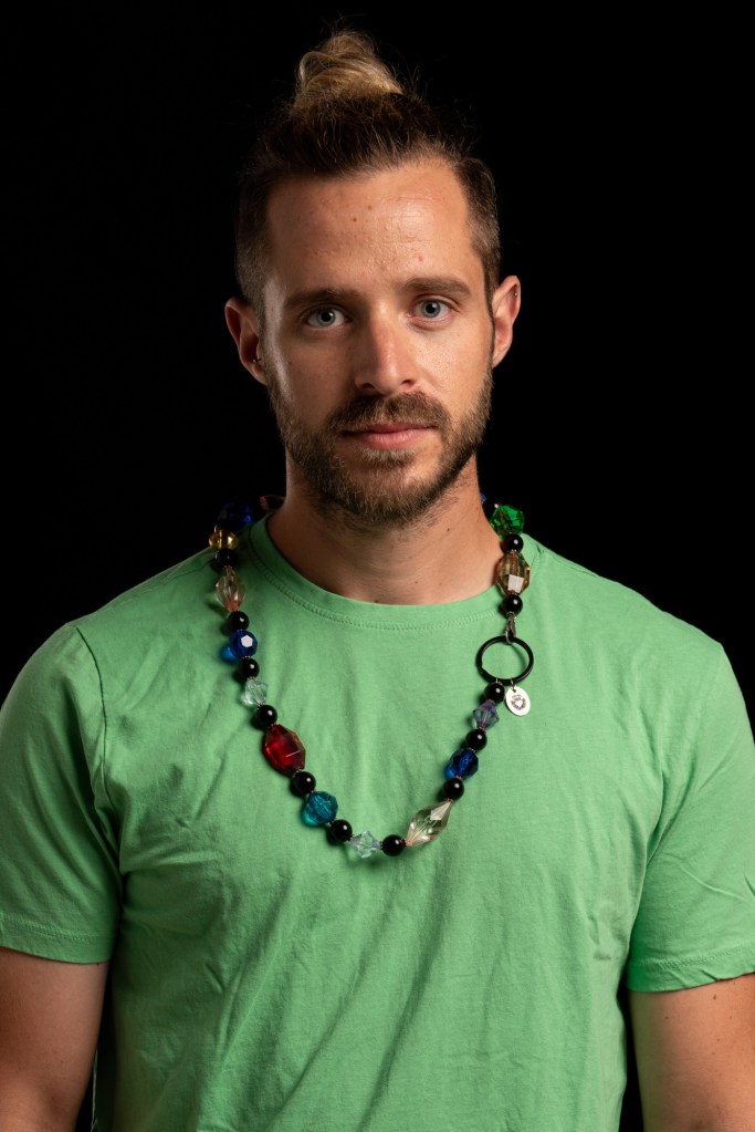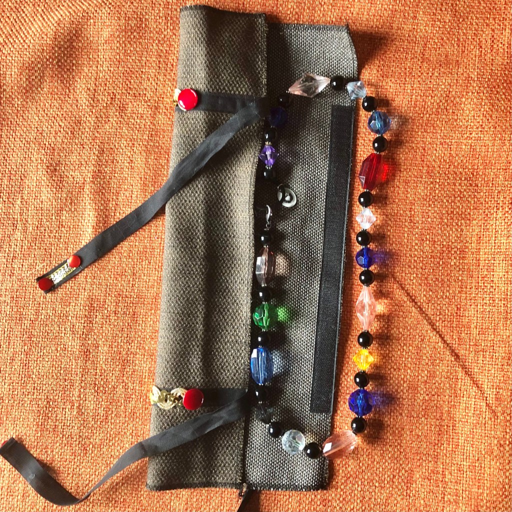 Collana composta da 71 pezzi tra cui spiccano 18 nere sfere di pasta di vetro, 17 gemme di plastica, 36 separatori. Manufatto creato assemblando vari materiali: plastiche (anche di valore), pezzi di bigiotteria, perle di pasta di vetro.